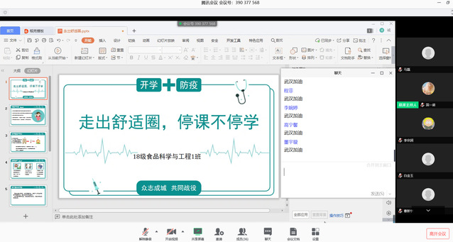 专题视频以丰富的内容,真挚的情感引发了食品学子的深刻共鸣。视频学习结束后,食品学子通过班级QQ群、微信群、视频会议等形式举行了“走出舒适圈·停课不停学”主题“云班会”,同学们借助网络表达对新学期的期待,分享假期中的思考和感悟。