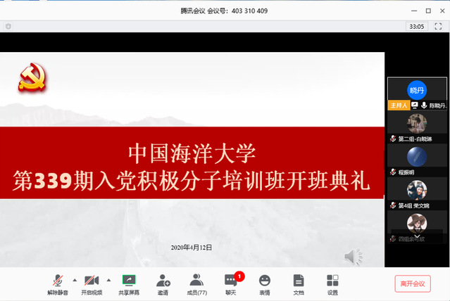 本站讯 4月12日下午,中国海洋大学第339期入党积极分子培训班开班典礼通过腾讯会议线上举行。食品科学与工程学院党委副书记程振明出席开班典礼,开班仪式由食品科学与工程学院辅导员张川主持,培训班全体学员参加。