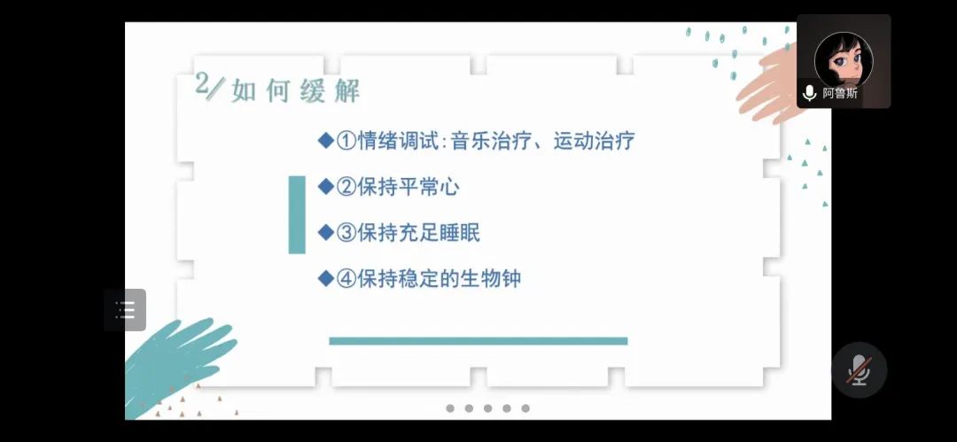 针对考前焦虑,阿鲁斯为大家分享了一些缓解考试焦虑情绪的方法:1.情绪调试,2.音乐治疗,3.运动治疗,4.保持平常心,5.保持充足睡眠,6.保持稳定的生物钟。