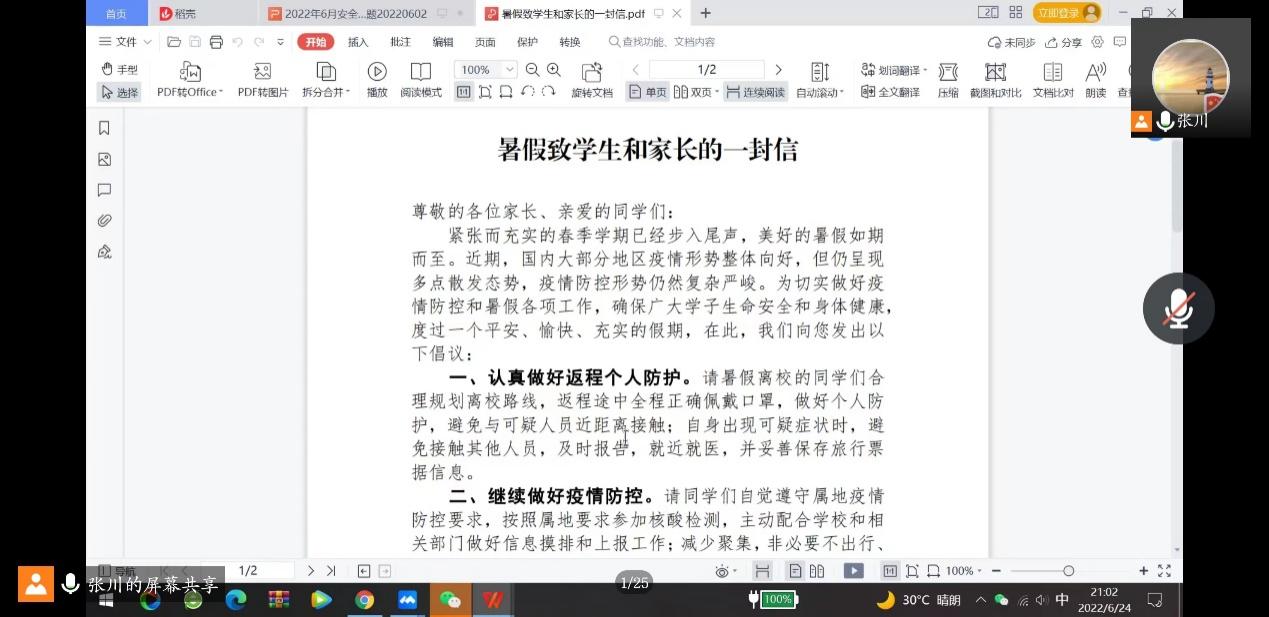 本次年级大会,首先由张川向大家介绍了《暑假致学生和家长的一封信》,围绕认真做好返程个人防护;继续做好疫情防控;增强安全防范意识;合理规划暑假生活4部分进行了详细解读。同时希望同学们认真遵守学校规定,强化风险意识,做好个人防护。