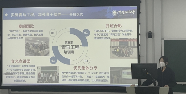本站讯 2022年12月1日下午,食品科学与工程学院第五期“青马工程”学生骨干培训班结班仪式在西海岸校区学习综合体南305顺利召开。学院党委副书记、副院长程振明,团委书记李想,团委副书记张川,辅导员丁晨阳以及第五期“青马工程”培训班全体学员出席结业式。