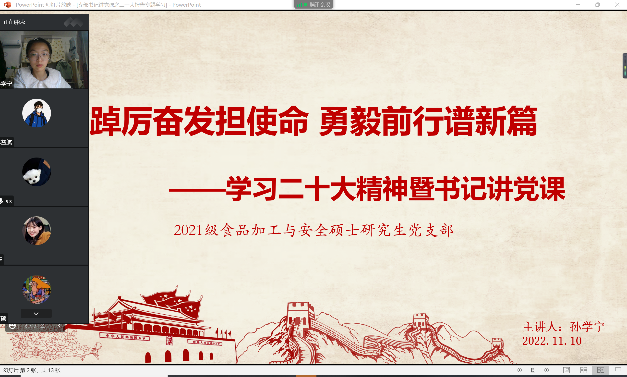 本站讯 2022年11月15日,食品科学与工程学院2021级食品加工与安全硕士研究生党支部书记孙学宁以《踔厉奋发担使命 勇毅前行谱新篇》为题,为全体支部成员讲解了一堂生动的专题党课。