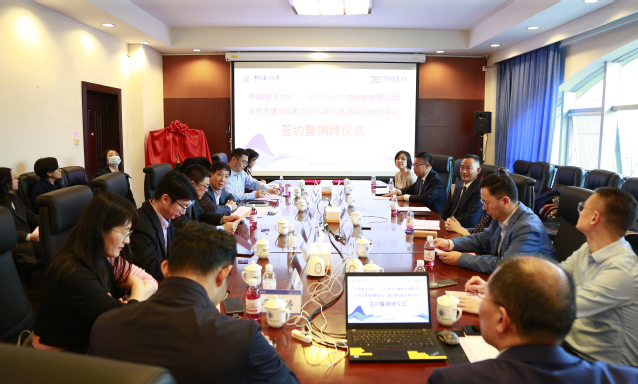 仪式上,王剑敏副校长与武传涛董事长共同为“高尿酸血症与痛风食品联合研究中心”揭牌。中国海洋大学科学技术处副处长宋欣与哲成生物总经理和燕代表双方签订《中国海洋大学-山东哲成生物科技有限公司合作共建高尿酸血症与痛风食品联合研究中心协议书》。食品科学与工程学院孟祥红教授介绍了“高尿酸血症与痛风食品联合研究中心”的合作共建背景与使命等情况。