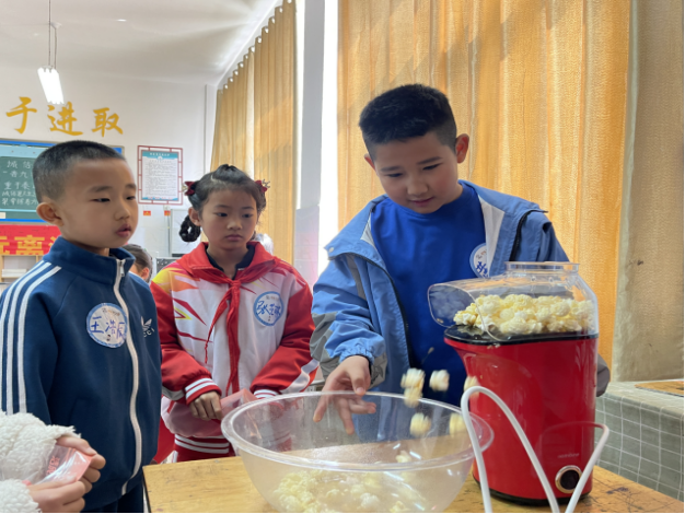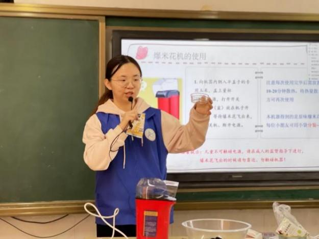 在芳香四溢的爆米花课堂上,主讲人贾文心(2022级食品加工与安全硕士)化身为“花花老师”,带领小朋友们制作香甜的爆米花。她首先为小朋友们讲解了爆米花的历史起源和传统做法,用两种方式为小朋友们演示爆米花的做法;并引导小朋友们观察有什么形状的爆米花并思考为什么。演示完毕后,小朋友们跃跃欲试、摩拳擦掌,满心欢喜地期待着接下来的动手实践环节。