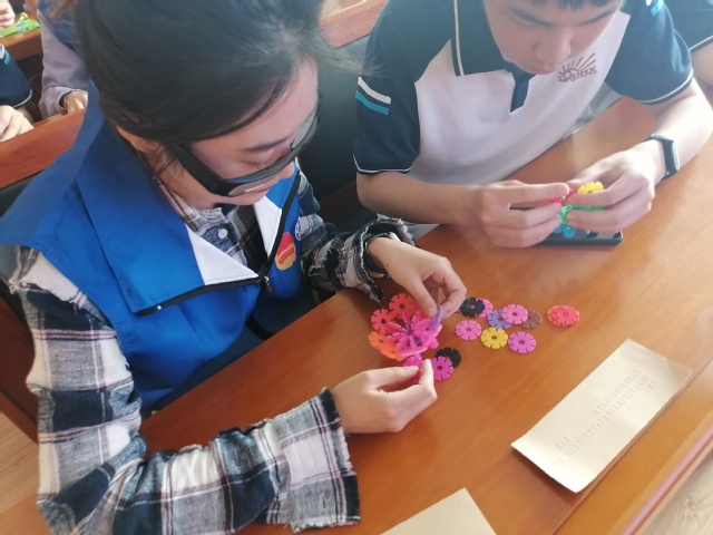 随后,志愿者们佩戴上特制眼镜,在盲校同学的帮助下开始了体验活动在适应了黑暗中行走的阶段后,一行人缓慢来到教室。志愿者们在盲校学生的热心指导下学习盲文书写、手工制作与盲人象棋。一位体验者同学说:身处黑暗之中,一开始非常没有安全感,即便引导者告诉我可以放心往前走,我也不敢迈大步子,总害怕自己踩空,害怕会撞到障碍物。通过亲身感受学习内容,志愿者切实了解到盲校学生在生活与学习等方面的艰辛与不易,更被他们乐观阳光的心态深深折服。