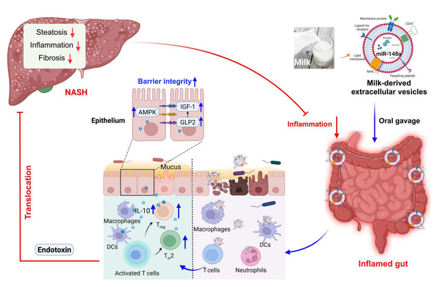 肠道屏障对营养吸收和阻止有害物质进入人体内循环至关重要。肠道屏障功能异常可导致“肠漏”,增加炎症性肠病、NASH代谢性疾病发生率。因此,保持肠道屏障完整性是预防和治疗代谢疾病的一种有效策略。细胞外囊泡(EVs)是由细胞分泌的纳米级囊泡,含有多种免疫调节蛋白和miRNA,在多种生理代谢过程扮演重要作用。源于母乳和牛乳的细胞外囊泡(mEVs)能够耐受胃肠道消化环境,具有良好的生物相容性和低免疫原性,可在肠道等部位发挥调节作用。前期研究表明,mEVs不仅可以增强健康小鼠的肠道免疫环境、维持肠道菌群,还可以修复营养不良小鼠的肠道屏障功能障碍。然而,mEVs在肠道及代谢疾病中的作用和机制尚未确定。