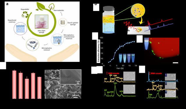 具体地,研究小组构建了一种食品基天然淀粉和明胶通过物理和化学交联而成的超轻、可生物降解的海绵,通过简单的收缩/回弹表现出高达~90%的脱除效率。其次,根据微塑料和油脂的疏水作用特点,利用甘油等乳化剂构建了稳定的水包油(O/W)乳液体系,实现了对海水、牙膏等多种复杂样品中微/纳塑料的富集;并结合显微拉曼技术,实现对微塑料成分的鉴定。这些研究结果创新性地为微塑料的高效脱除和鉴定奠定了理论基础,有望成为对微小塑料污染物进行工业甚至家庭净化的应用提供新材料和新方法。