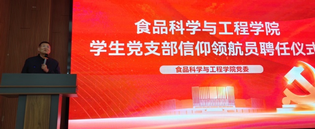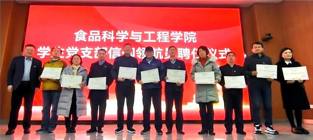 本站讯 为充分发挥优秀教工党员的教育引领作用,提升学生党员的先进性和纯洁性,12月14日下午,学院党委举办学生党支部“信仰领航员”、党建工作室成员聘任仪式。食品科学与工程学院党委书记于德华,党委副书记、副院长程振明,各学生党支部“信仰领航员”出席活动。学院党委专职组织员曹亚楠主持聘任仪式。