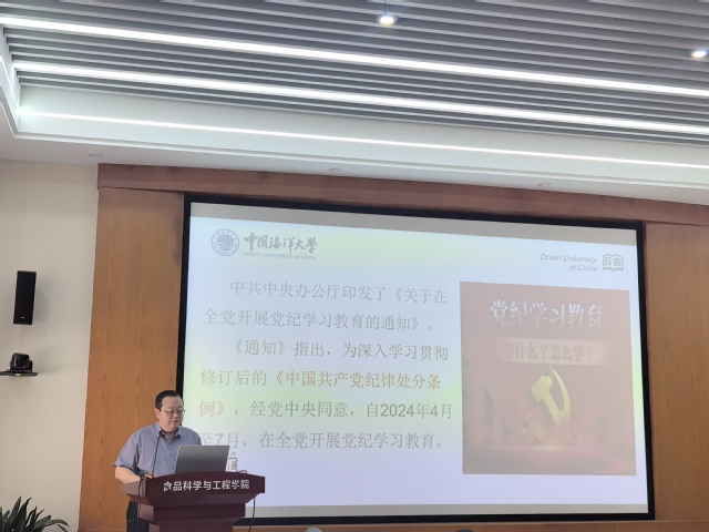 本站讯 为持续推进党纪学习教育走深走实,引导党员干部学纪、知纪、明纪、守纪,2024年6月28日,食品科学与工程学院教工第二党支部书记赵元晖为支部党员讲授党纪学习教育专题党课。