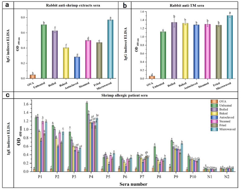 Fig. 2. Indirect ELISA for pooled rabbit antisera against raw shrimp soluble extracts (b) and TM (c) IgG binding, and shrimp patient serum IgE binding to raw and different heat-treated shrimp extracts. The data is presented as the mean values for triplicates and the standard deviation is indicated by error bars. Different lowercase letters in column mean significant differences (P < 0.05) among raw and different heat-treated shrimp extracts.