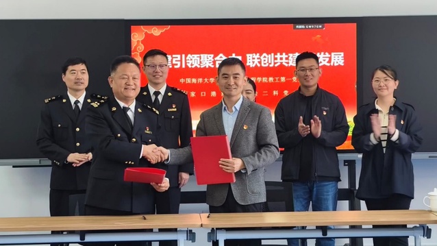 参观结束后,本支部党员与董家口海关党支部成员围绕“党建引领聚合力,联创共建促发展”主题召开座谈会。董家口海关马轾国副关长率先致辞,对支部成员的到访表示热烈欢迎,并期望在检验技术等方面获得中国海洋大学食品学院的支持,携手探寻切实可行的合作方向,于食品安全领域取得更突出的成果。紧接着,海关孙建国书记全面介绍了董家口海关的整体情况,进一步表达了与海大食品学院加强合作的愿景。支部孙建安书记随后发言,诚挚感谢海关提供的宝贵交流机会,并对本支部概况进行介绍,充分表达了对双方未来合作的热切期待。最后,在全体成员的共同见证下,海关党支部孙建国书记与教工第一党支部孙建安书记郑重签订共建协议,并合影留念,为双方后续深化合作奠定坚实基础。