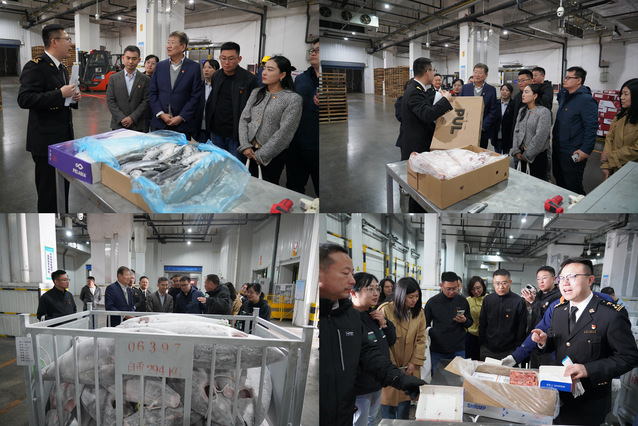 图1 海关綦虎山科长介绍部分进境水产品和肉品