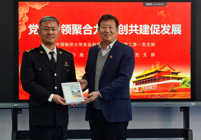 教工第一党支部林洪教授作总结发言,指出党建引领下的高校科研教学,党支部当勇立潮头先行示范,为后续如现场快检等深入合作筑牢根基;并结合习主席回信精神强调,将企业难题与监管部门需求锚定为科研方向,切实推动科研服务社会。同时提及青岛海关与学校早有长期合作渊源,此前曾联合出版书籍《国际贸易水产品图谱》,现场特赠予海关同仁借鉴参考。林洪教授还倡导科研应打破学科壁垒,积极推动与物理、化学、自动化等学科跨学科协作,从科技维度开展跨行业合作。最后林洪教授代表党支部诚挚欢迎马关长带队莅临学校参观指导工作。