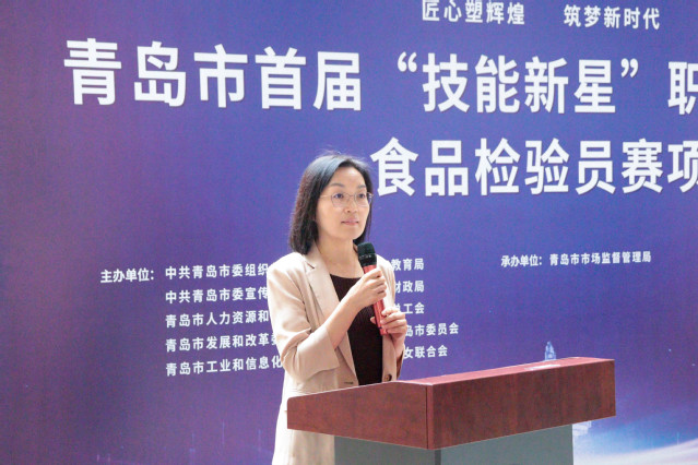 中国海洋大学食品科学与工程学院党委副书记、副院长程振明出席开幕式并致辞。程振明代表学院对参加大赛的嘉宾、选手表示欢迎,对青岛市市场监管局能将本次赛事放在学院举办表示感谢。她强调,食品检验员是保障食品安全的重要力量,本次大赛不仅是对选手们专业技能的检验,更是对食品安全责任意识的传承。她希望选手们在比赛中充分展示自己的专业素养和技能水平,赛出风格、赛出水平,通过此类赛事激发青年技能人才的创新活力,弘扬工匠精神,为国家人才战略实施注入新动能。