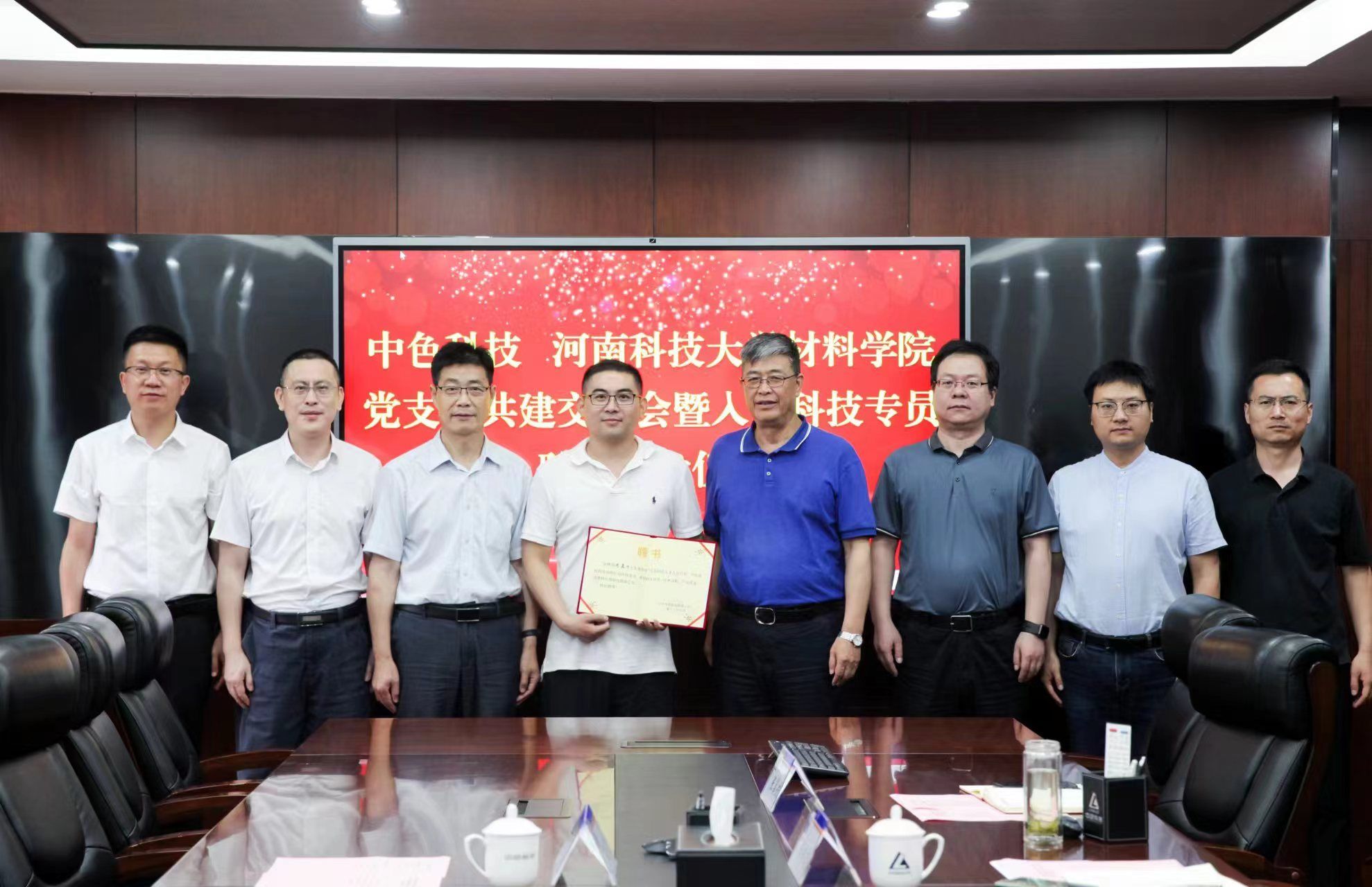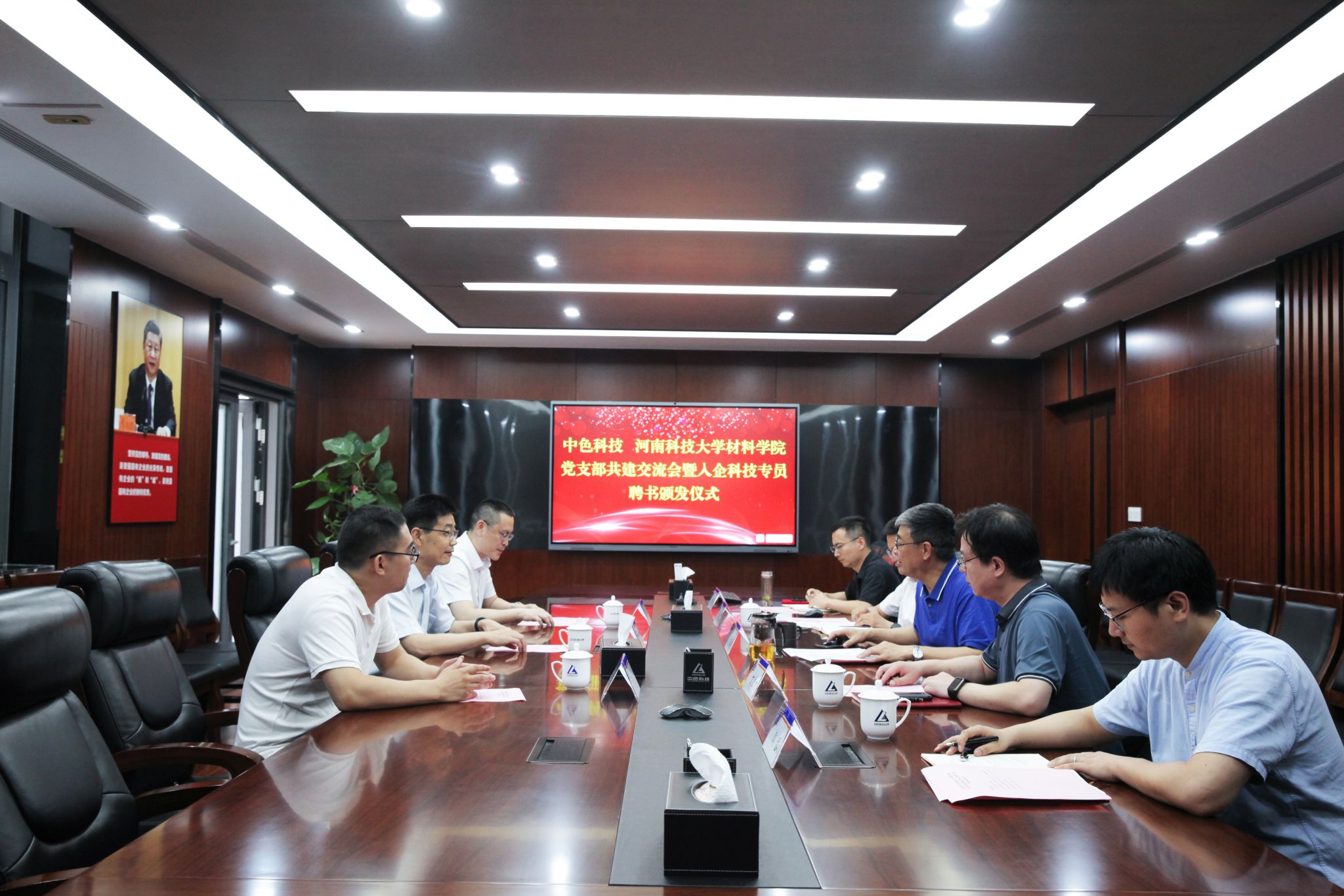 党委书记李怀民一行到中色科技股份有限公司交流党建和科技创新工作,并举行入企科技专员聘书颁发仪式。公司主持工作的党委副书记、副总经理赵志锐出席交流活动,并为受聘的入企科技专员周孟博士颁发聘书。