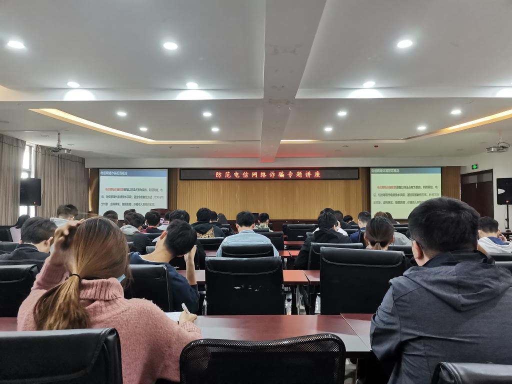 专兼职辅导员和学生干部在工科一号楼5059学术报告厅观看防范电信网络诈骗专题讲座直播。其他学生以宿舍为单位通过网络在手机或电脑端收看