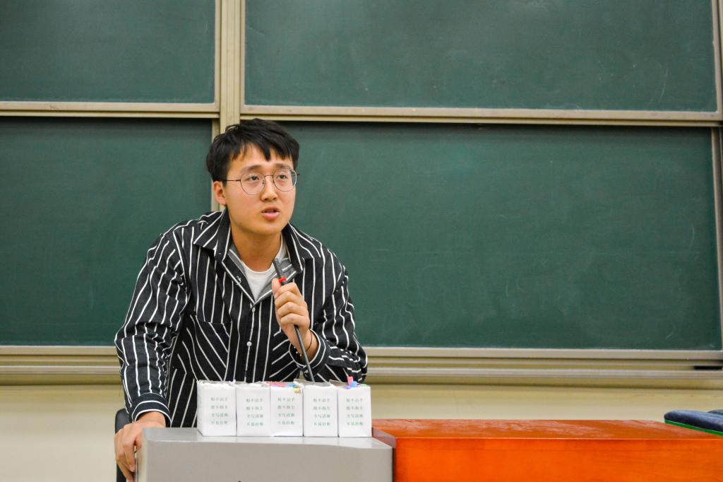 李艺轩向全体同学介绍英语四级考试流程、时间以及考生须知。希望学生们提前做好准备,学习英语,功在平时,遇到困难,及时请教老师或前往图书馆查询资料。胡炳利在李艺轩介绍的基础上,补充了一些考试注意事项。例如在考试中遇到问题要保持从容镇定,做题先易后难。考前不要过度焦虑,要保持良好心态等。两位同学在最后都向新生送出了自己的祝福。