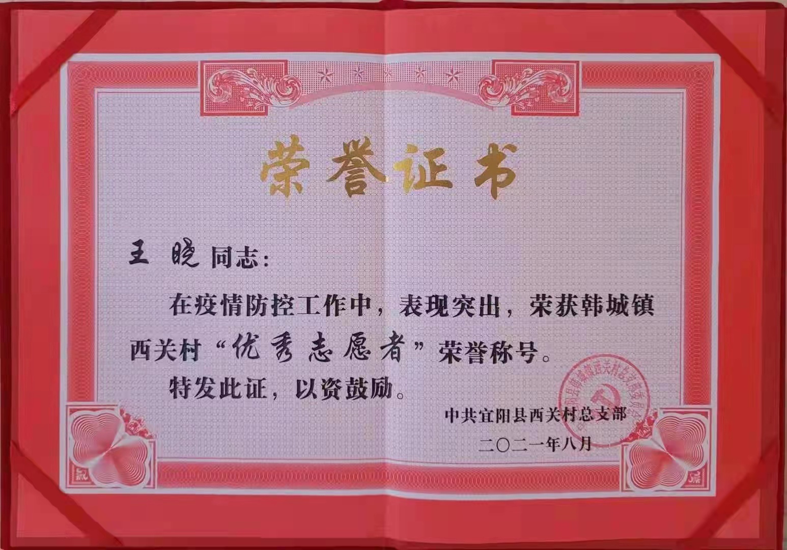 王晓同学在疫情防控的非常时期,帮助村委人员在卡口测体温,看健康码,登记出入车辆信息,排查返乡人员信息,用年轻的肩膀扛起社会责任,用实际行动抗击疫情,为打赢疫情防控阻击战奉献爱心和力量,保卫了人民群众的生命健康。
