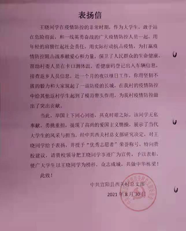近日,我校收到来自宜阳县西关村总支部的表扬信,对我校学生踊跃投身家乡疫情防控志愿服务的行为表示肯定和感谢。