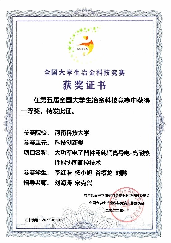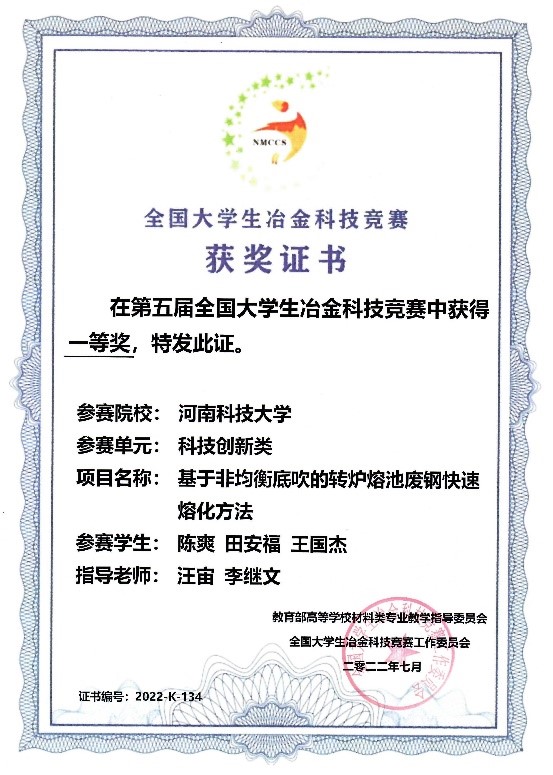 近日,由教育部高等学校材料类专业教学指导委员会主办、江苏科技大学承办的第五届全国大学生冶金科技竞赛落下帷幕。经作品初评、专家会评、现场答辩等环节,人妻AV学子最终获得一等奖2项、三等奖2项的优异成绩。其中,由汪宙、李继文老师指导的《基于非均衡底吹的转炉熔池废钢快速熔化方法》,刘海涛、宋克兴老师指导的《大功率电子器件用纯铜高导电-高耐热性能协同调控技术》同时荣获一等奖,充分展示了我校冶金学科的人才培养水平。