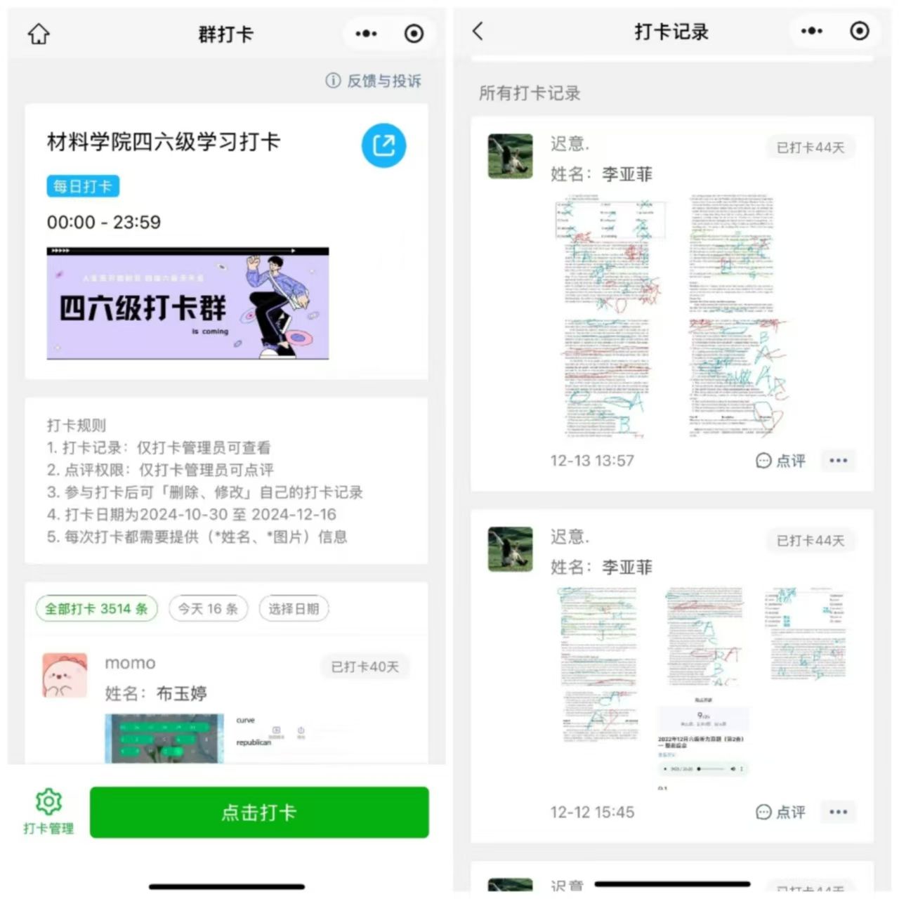 打卡活动旨在通过真题打卡和单词记忆,帮助同学们巩固知识,提升应试能力,减轻备考压力。在活动过程中,参与打卡的同学每日利用碎片时间通过应用百词斩、网易有道词典等app进行打卡或者以手写的方式积累词汇,并拍照或截图在小程序上上传自己的学习进程,即为打卡成功。打卡活动于10月31日开启,累计参与人数218人,累计打卡3514次,这一系列的数据和成果,不仅是对同学们学习成果的肯定,更是对积极学习态度和持之以恒精神的生动体现。