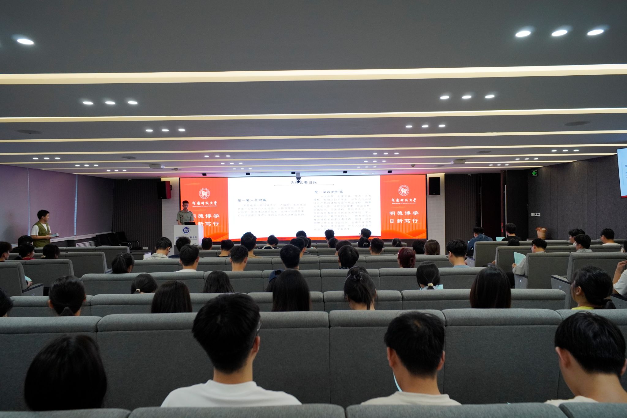 王琳霄通过丰富的例子向大家强调,军队是培养人才的大熔炉,是锻造品格的练兵场,希望同学们把个人理想融入强国梦、强军梦,在军营中书写壮丽的青春篇章。退伍大学生赖李豪分别讲解了大学生参军入伍的条件和个人发展途径,并讲述了自己在部队中经历的严格训练、执行的特殊任务,以及收获的战友情谊。鼓励同学们积极投身军营,在部队成长成才,号召同学们用奋斗的青春实现自己的理想。