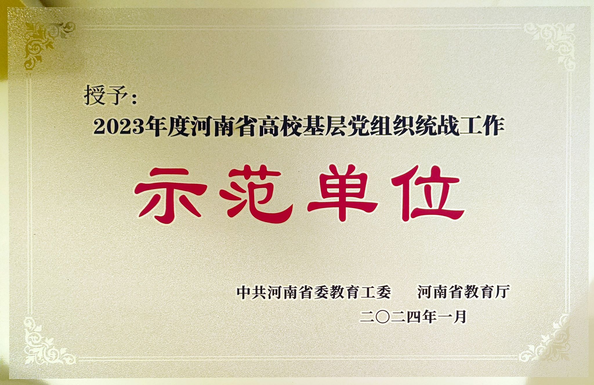 党委获“2023年度河南省高校基层党组织统战工作示范单位”。
